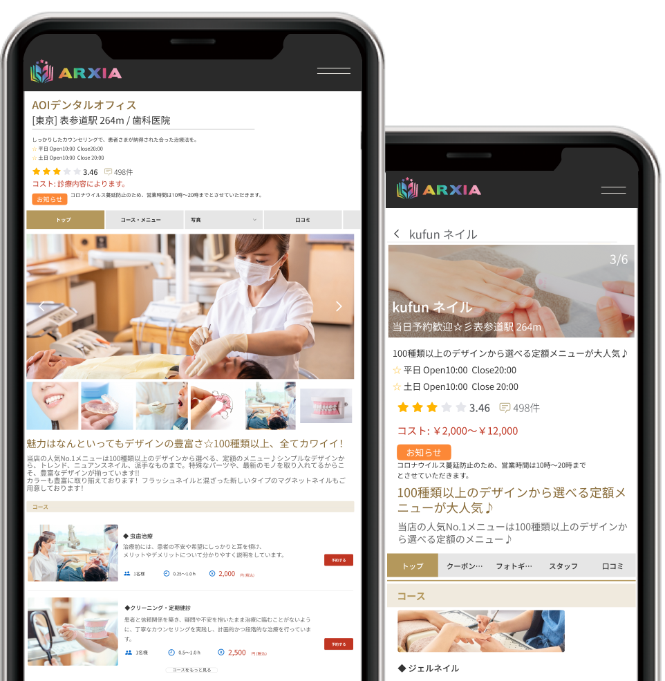 ARXIAは、集客ポータルサイトと予約システムが一体化した新しい形の総合予約システムです。SNS連携、ZOOM連携、求人募集など、どんなビジネスにもフィットする高機能・多機能な予約システムを提供します。大勢のユーザーが集まる場所であなたのお店をアピールでき、多機能で使いやすい予約システムは、月額0円から利用可能です。