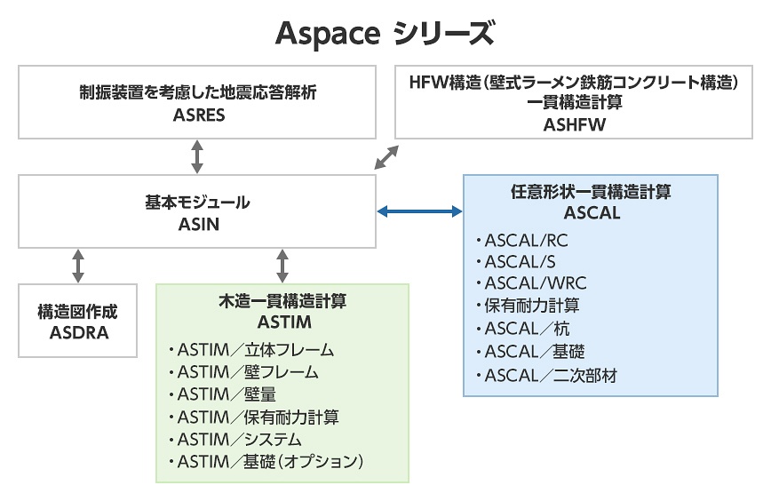 Aspaceシリーズは、構造計算ソフトのASCAL / ASTIMを含む製品群で、各種一貫構造計算、地震応答解析、構造図作成、積算を行う建築用計算プログラムを提供します。木造、非木造の一貫構造計算ソフトや、構造図作成ソフト、地震応答解析ソフトなどがあり、ASINという共通のモデラーによってモデル作成されるため、複数の機能を保持することができます。これにより、建築設計の効率化と精度向上を実現します。