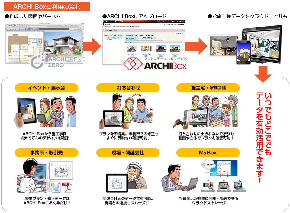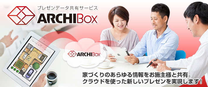 ARCHI Boxは、図面やパース・提案動画などをクラウド上にアップロードし、社内やお施主様、取引先と共有できるサービスです。無料のiOSアプリでiPadやiPhoneを使ったスピーディーな提案が可能で、場所・時間を問わず幅広くデータを有効活用できます。ARCHITREND ZEROやGLOOBEなど、複数の対応製品と連携し、建築設計のプレゼンテーションを強力にサポートします。