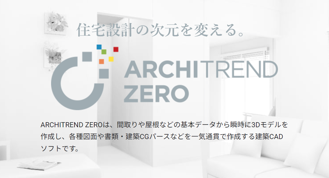 ARCHITREND ZEROは、間取りや屋根などの基本データから瞬時に3Dモデルを作成し、各種図面や書類・建築CGパースなどを一気通貫で作成する建築CADソフトです。リノベーション機能と省エネ設計機能を強化した「ARCHITREND ZERO Ver.10」をリリースし、リノベーション現況調査アプリ「りのべっち」リリースとデータ連携を実現しています。3次元モデルが連動して最新レンダリング技術によるフォトリアルCGパースを作成し、訴求力の高いスピーディーなプレゼンテーションを実現します。また、3Dカタログ.comでシミュレーションした様々な実メーカーの建材・住宅設備データがシームレスに連携し、リアルな設計やプレゼン・積算が可能です。
