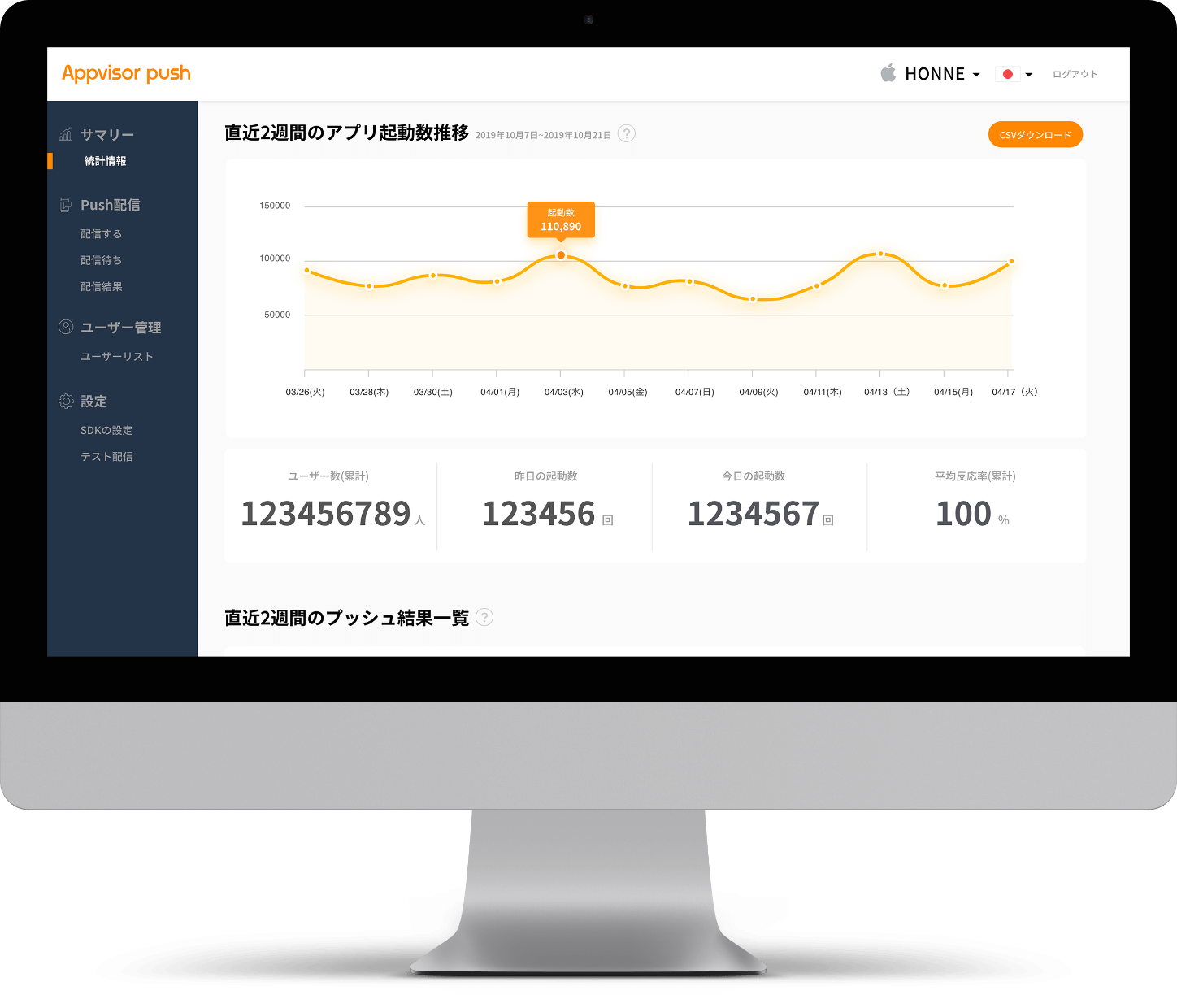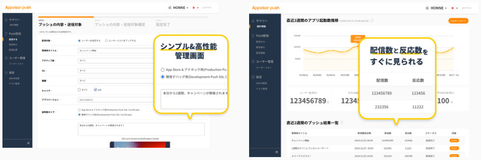 Appvisor pushはPUSH通知に必要な機能がオールインワンで導入されており、様々なビジネスシーンにフィットします。導入も専門のエンジニアがサポートします。1億ユーザ突破!大手アプリに選ばれています。社内、クライアント、パートナー、あらゆる要件に合わせたPUSH配信が実装可能です。充実のAPIを実装し、カスタマイズに積極対応します。