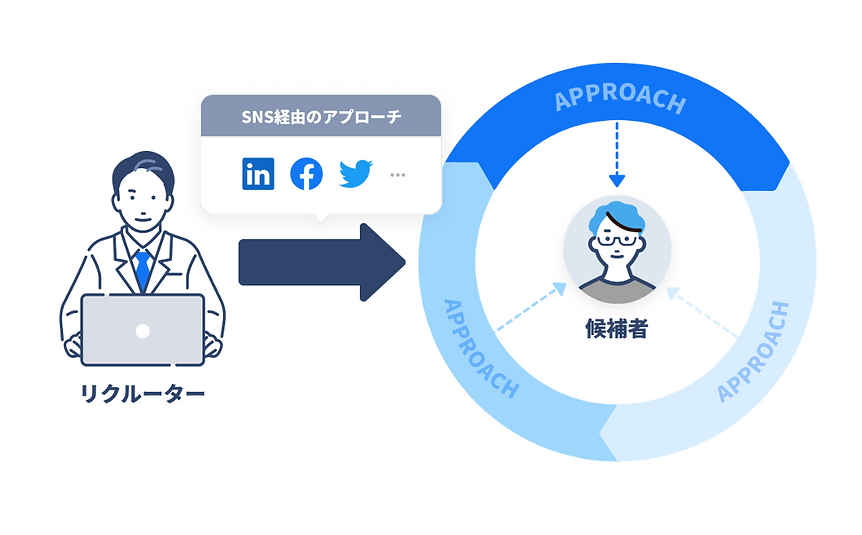 SNSなどの膨大なオープンデータから候補者を検索し、転職プラットフォームには登録していない転職潜在層にも母集団を広げ、優秀な人材を見つけることが可能です。