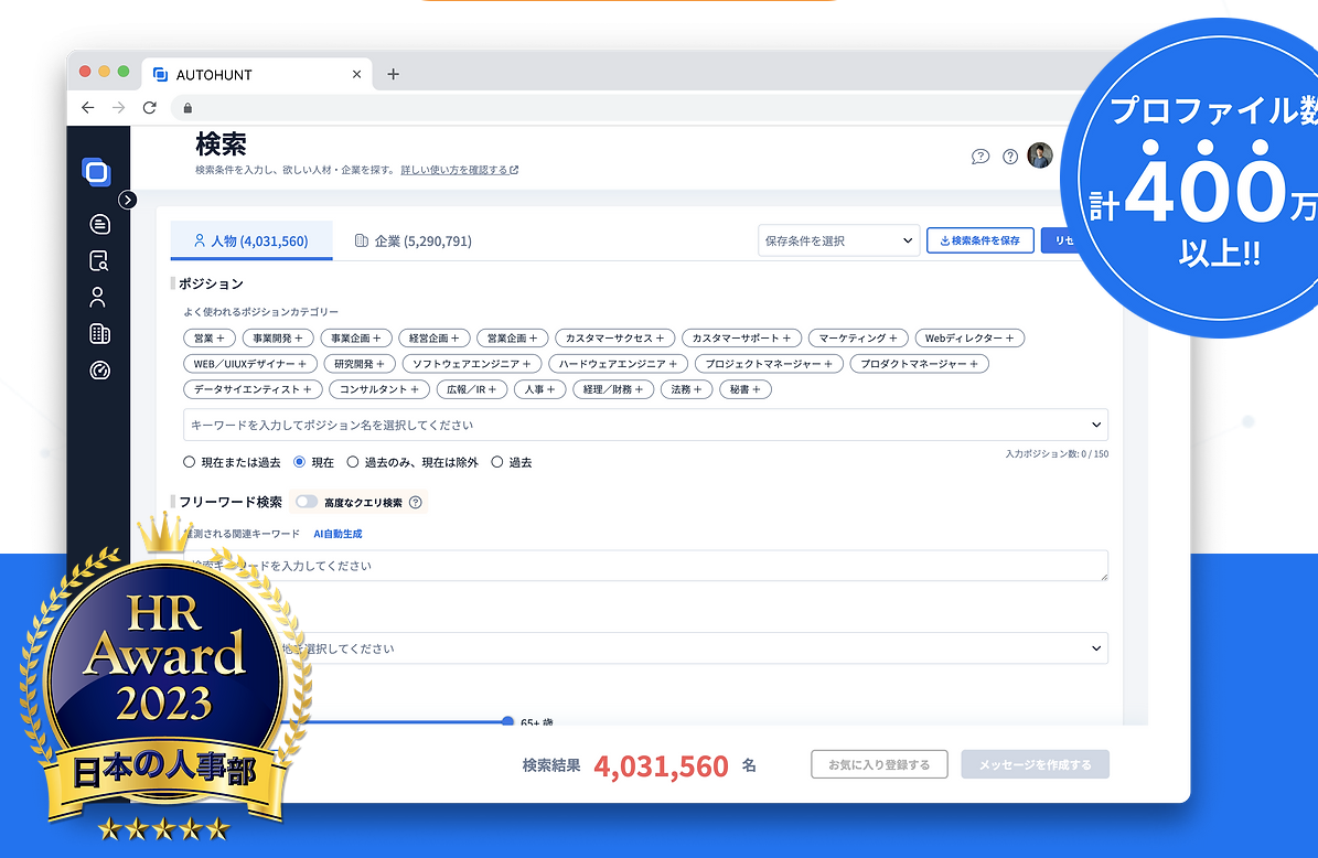 AUTOHUNTは、転職潜在層の優秀な人材をいち早く見つけ出し、早期に接点を持つことで採用競争力を強化する次世代型AIタレント検索エンジンです。SNSなどの膨大なオープンデータから候補者を検索し、転職プラットフォームには登録していない転職潜在層にも母集団を広げ、優秀な人材を見つけることが可能です。また、採用関連業務を約60%削減し、採用MA/CRMの機能を包含し各種自動化を実現することで、業務工数を大幅に削減します。