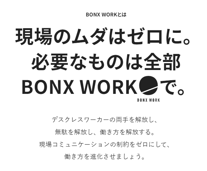 BONX WORKは、チームのパフォーマンスを最大化する現場コミュニケーションのワンストップソリューションです。デスクレスワーカーの両手を解放し、無駄をなくし、働き方を進化させることを目指します。ハンズフリー、プッシュトゥトークを可能にする通話方法や、無制限の同時利用人数/ルーム作成数、チャット・音声読み上げ、録音・文字起こしなど、現場のための機能が詰まっています。また、アナリティクス機能により、自然発生するコミュニケーションを量的/質的に分析し、現場の見える化を目指します。