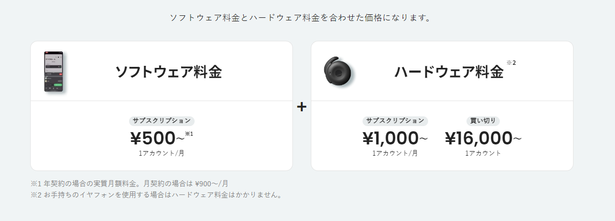 ソフトウェア料金は月額500円〜、ハードウェア料金は月額1,000円〜または買い切り16,000円〜(価格はすべて税抜)
