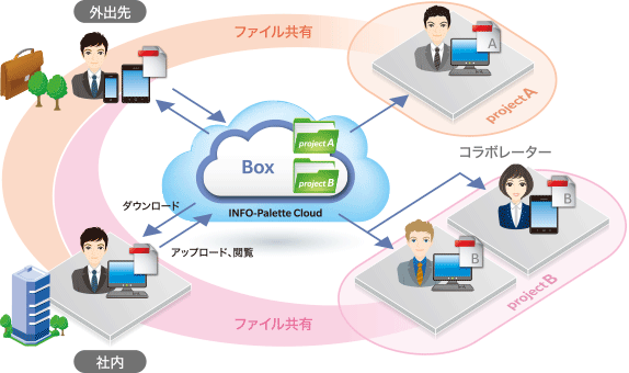 コニカミノルタが提供する「クラウドストレージ Box」は、企業の厳格な利用要件を満たす管理機能を備えた、セキュアな環境でビジネスに活用できるファイル共有クラウドサービスです。保存容量無制限、安全なファイル共有、ファイルの履歴管理、モバイル端末の有効活用など、業務の生産性をアップする機能が充実しています。大容量ファイルの受け渡しや社内外の効率的な情報共有、外出先や移動中にセキュアで簡単に必要なファイルを確認することが可能になります。