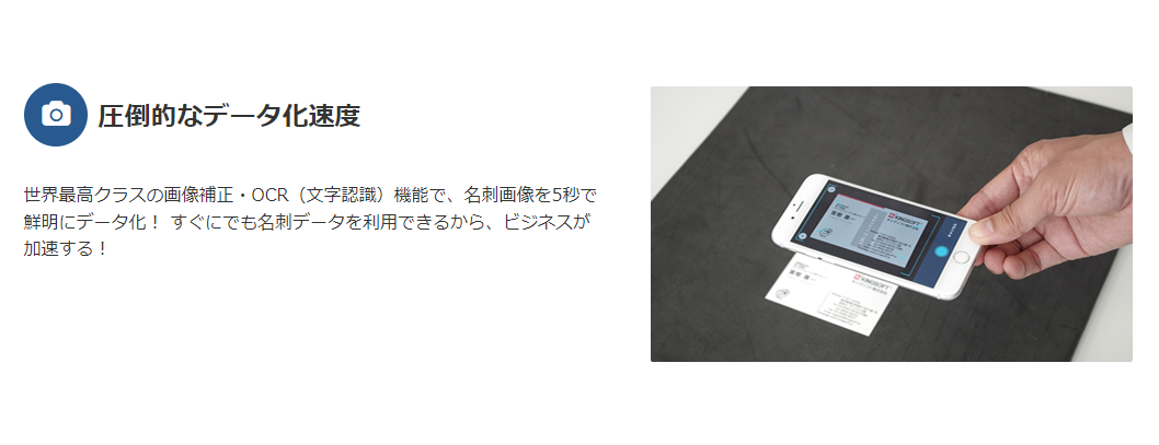 名刺をスマホで撮影するだけで即データ化。顧客情報を全社で共有。オンライン上で名刺情報の交換・共有が可能。OCR機能によるデータ化の精度は90%以上。エクスポート機能あり。オペレーターによるデータ補正を行う。Salesforceなど外部システムとも連携可能。