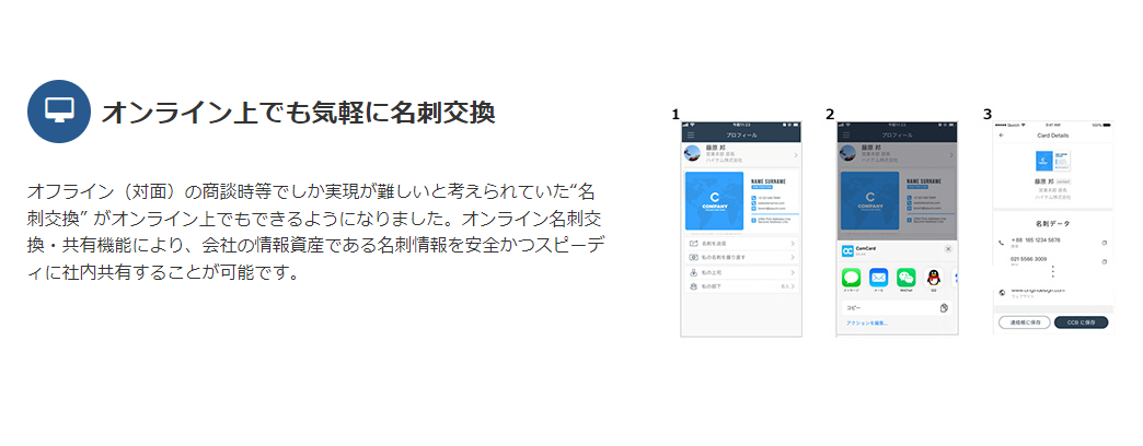 CAMCARD BUSINESSは名刺をスマホで撮影するだけで即データ化が可能。顧客情報を全社で共有し、オンライン上で名刺情報の交換・共有が可能。OCR機能によるデータ化の精度は90%以上で、Salesforceなど外部システムとも連携可能。