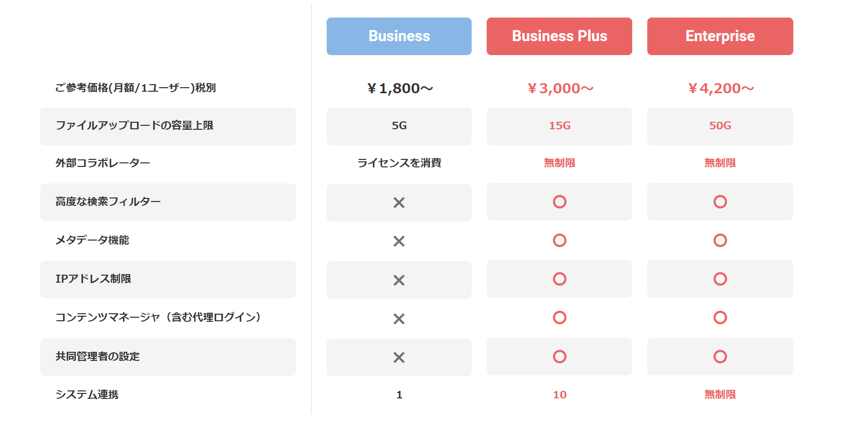 「Business」「Business Plus」「Enterprise」の3種。ご参考価格(月額/1ユーザー)税別:¥1,800~