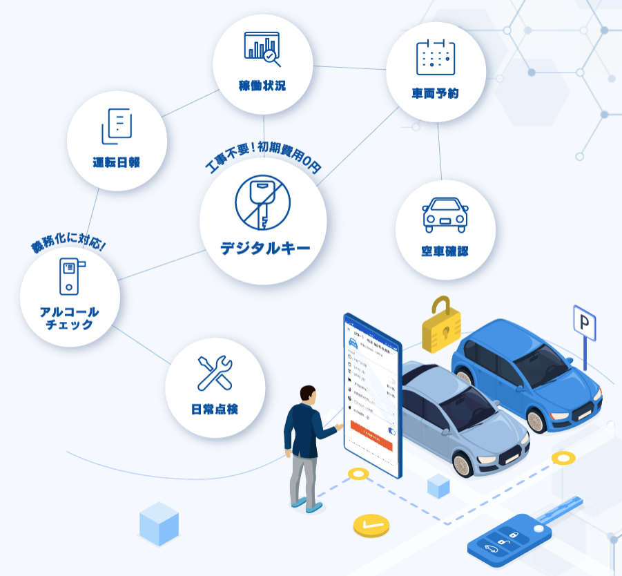 Bqeyは、社用車に関わる業務改善を全面的にサポートするサービスです。クラウドでの書類一括管理、社用車の適正台数判別、非対面での鍵の受け渡し解消、アルコールチェック義務化対応など、多彩な機能を搭載しています。操作の簡単さとデジタル化による業務効率の向上、煩わしい管理作業の削減を実現し、満足度92.3%を誇ります。課題解決に向けてスピーディに対応し、70年の実績を持つ車の鍵屋としての信頼と確かな実績で安心安全をサポートします。