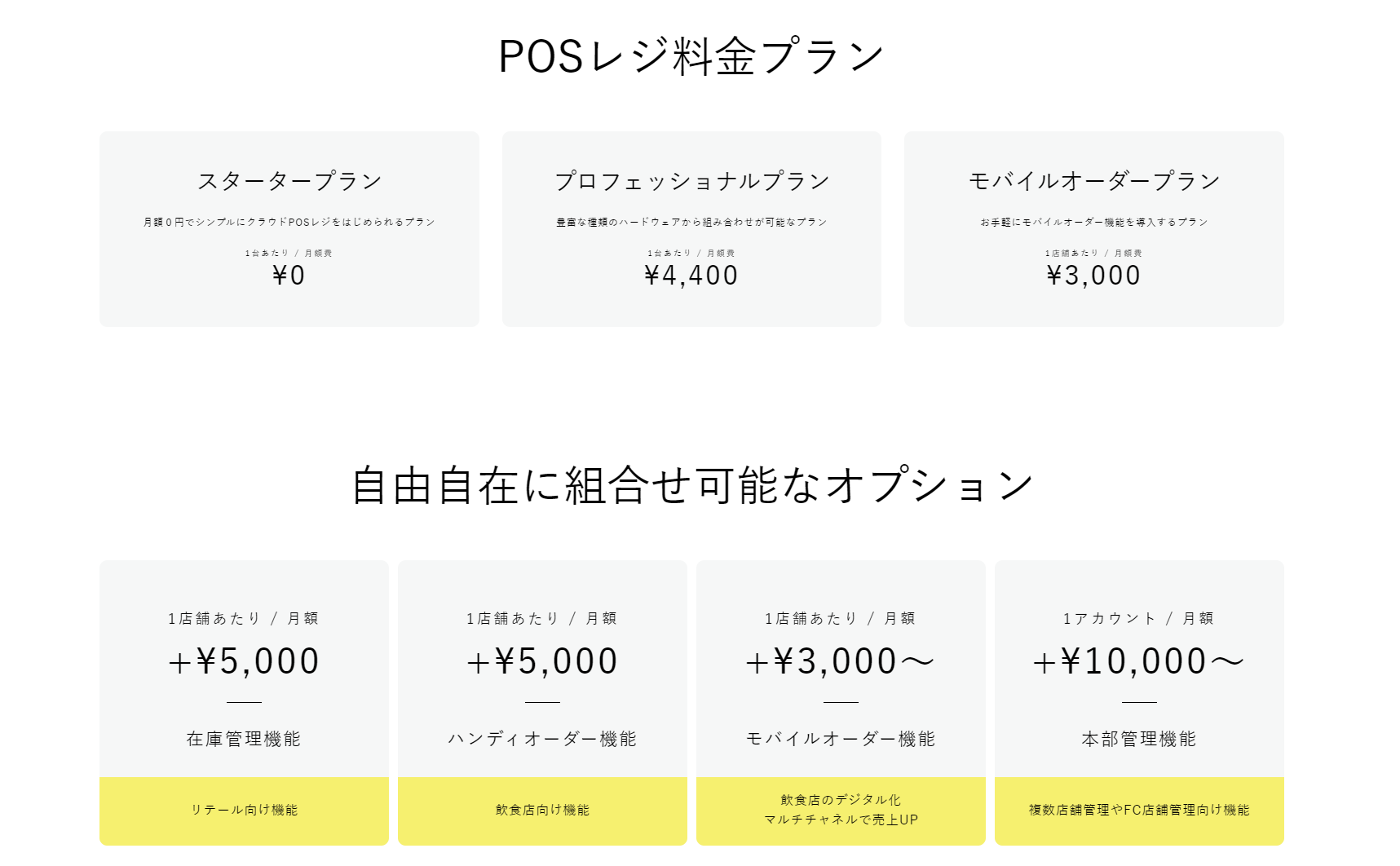 スタータープラン:月額0円、プロフェッショナルプラン:月額4,400円、モバイルオーダープラン:月額3,000円、その他オプション:価格はプランにより異なる