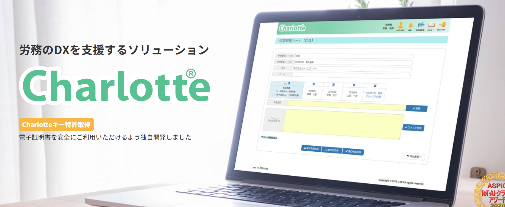 Charlotteは、労務担当者の業務を幅広く支援するクラウドサービスです。電子申請対応手続き111種類に対応し、社会保険・労働保険の申請業務、税申告などに対応。簡単な操作で業務負荷を減らし、働き方改革をサポートします。初期費用不要で、万全のセキュリティ体制を備え、人事給与システムを選ばずに利用可能です。