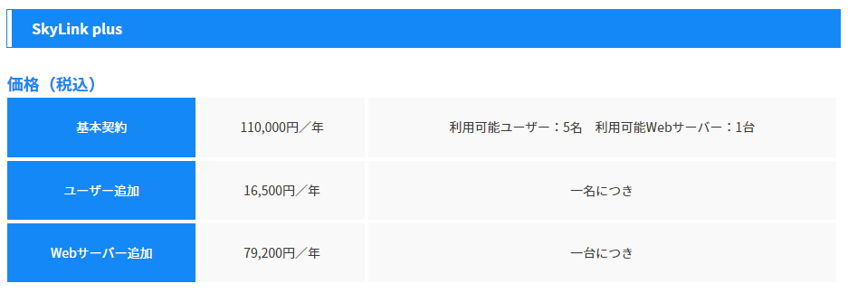 基本契約:110,000円/年 利用可能ユーザー:5名 利用可能Webサーバー:1台