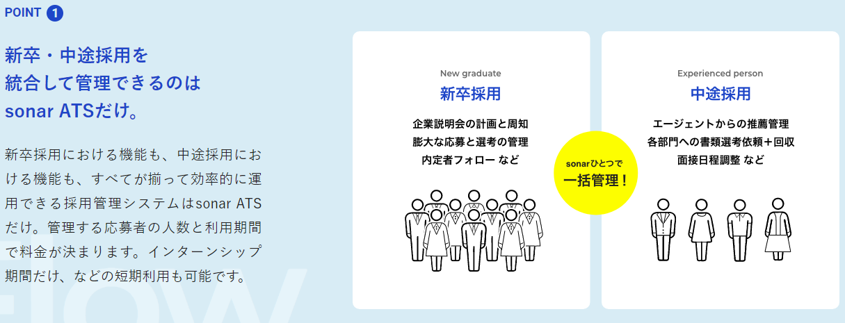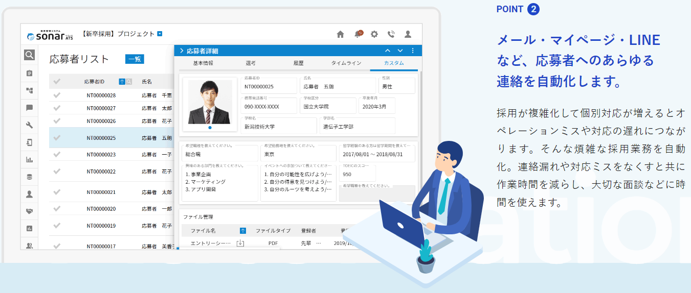 sonar ATSは新卒採用、中途採用を統合して管理できる唯一の採用管理システムです。煩雑な採用業務を可視化、自動化、効率化し、業務ではなく応募者と向き合う時間が確保できます。