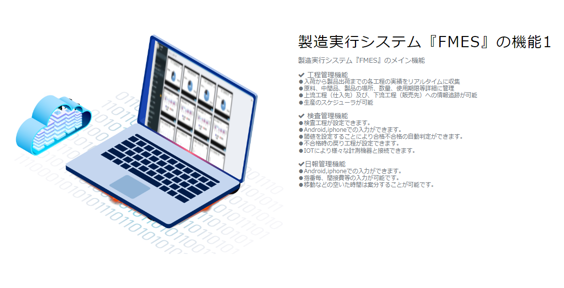 FMESは、製造工程の状態把握や管理、品質データ管理分析、作業者への指示や支援等をリモートかつリアルタイムで管理するシステムです。生産工程が可視化され属人化の解消に繋がります。スマホやタブレットで入力された進捗や検査データがブラウザによる管理画面でリアルタイムにチェックできます。