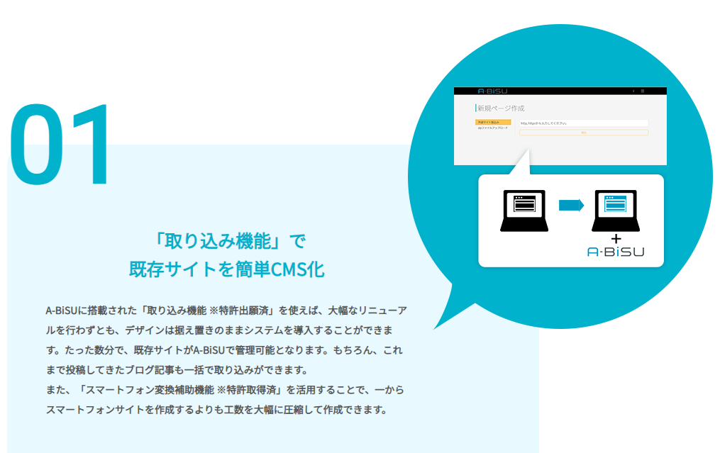 A-BiSUに搭載された「取り込み機能」を使えば、大幅なリニューアルを行わずとも、デザインは据え置きのままシステムを導入することができます。たった数分で、既存サイトがA-BiSUで管理可能となります。もちろん、これまで投稿してきたブログ記事も一括で取り込みができます。