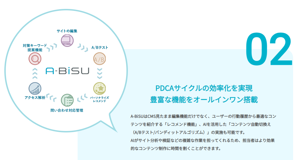 A-BiSUはCMS見たまま編集機能だけでなく、ユーザーの行動履歴から最適なコンテンツを紹介する「レコメンド機能」、AIを活用した「コンテンツ自動切換え(A/Bテスト/バンディットアルゴリズム)」の実施も可能です。AIがサイト分析や検証などの複雑な作業を担ってくれるため、担当者はより効果的なコンテンツ制作に時間を割くことができます。