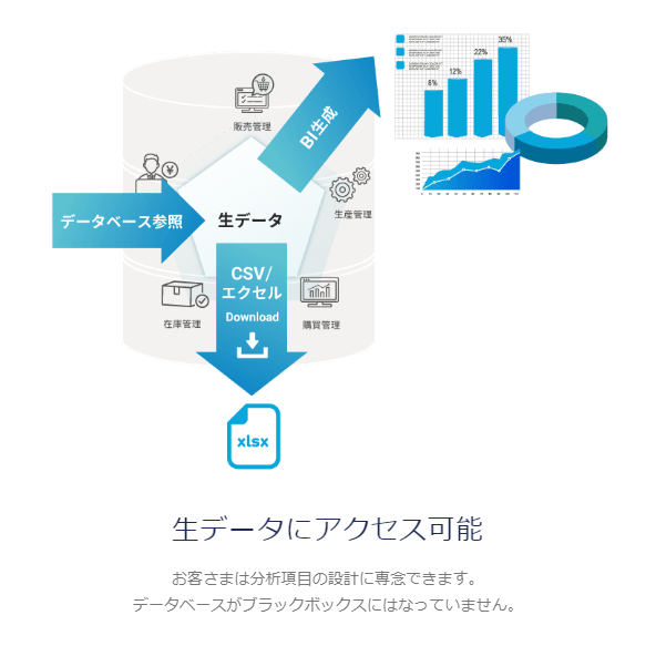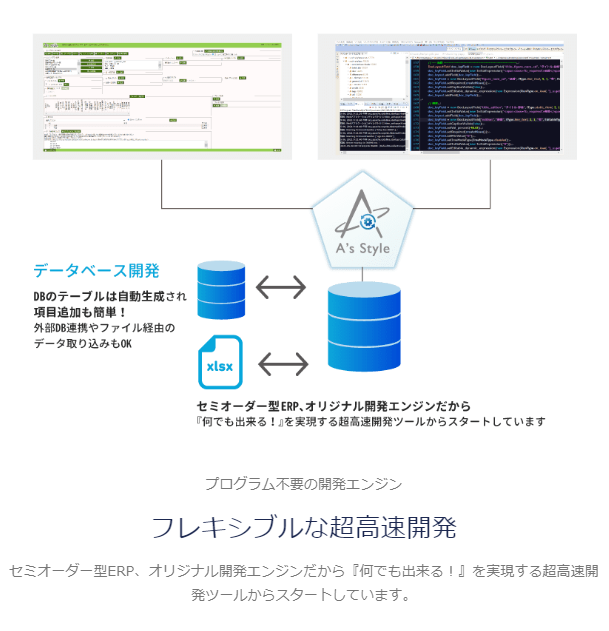 クラウドサービスとして提供され、一味違うERPソリューションを実現。プログラム不要の開発エンジンによるフレキシブルな超高速開発が特徴。生データにアクセス可能で、取引先・グループ会社との共同利用が可能。AI-OCR+RPAとの連携や外部システムとの連携もサポートしています。