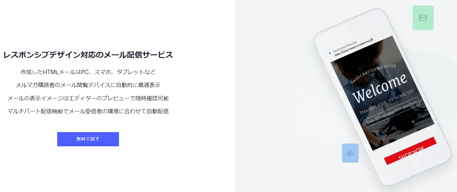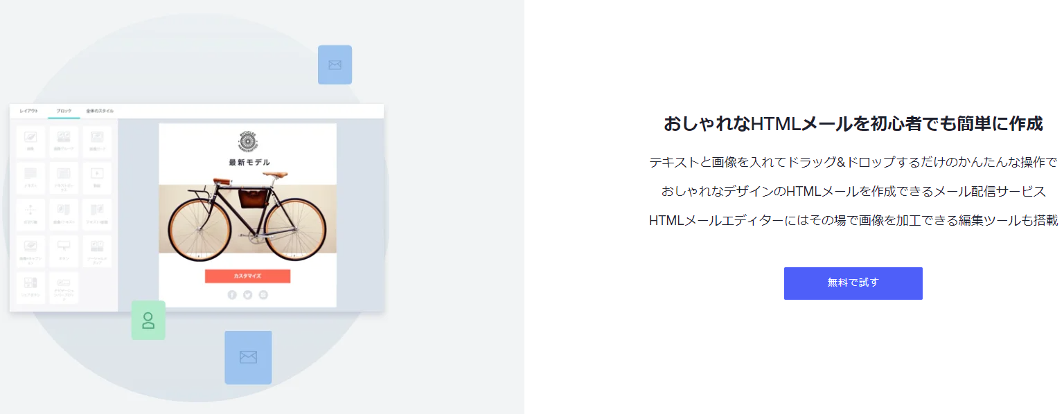 おしゃれなデザインのHTMLメルマガをかんたんに作成・配信・効果測定できるメール配信サービス