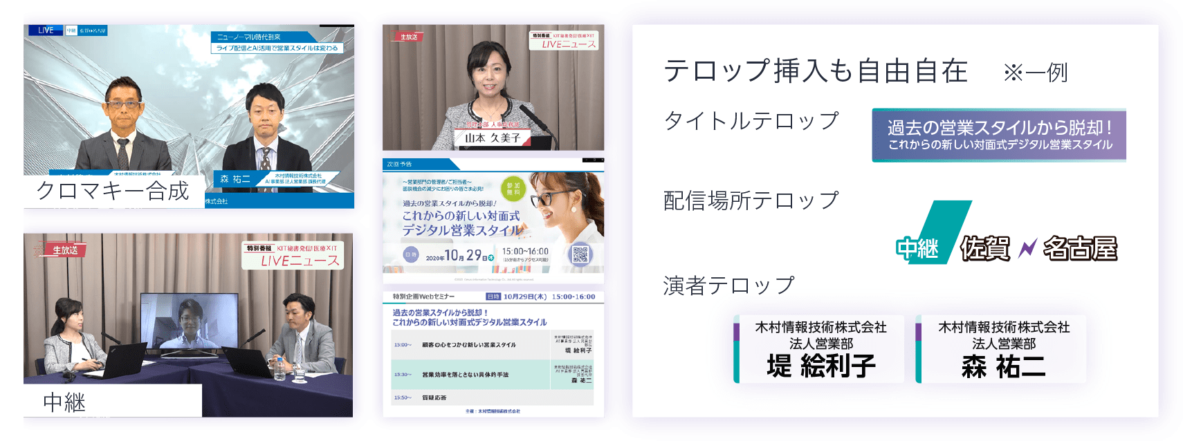 BizLiveは、シーンの切り替えやテロップの挿入等、会に合わせた様々な演出を自由自在に行えるライブ配信サービス。事前の準備からお手伝いし、クロマキー合成技術や遠隔地からの講演も可能。