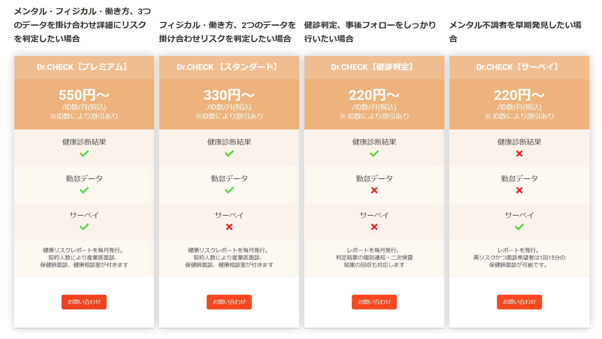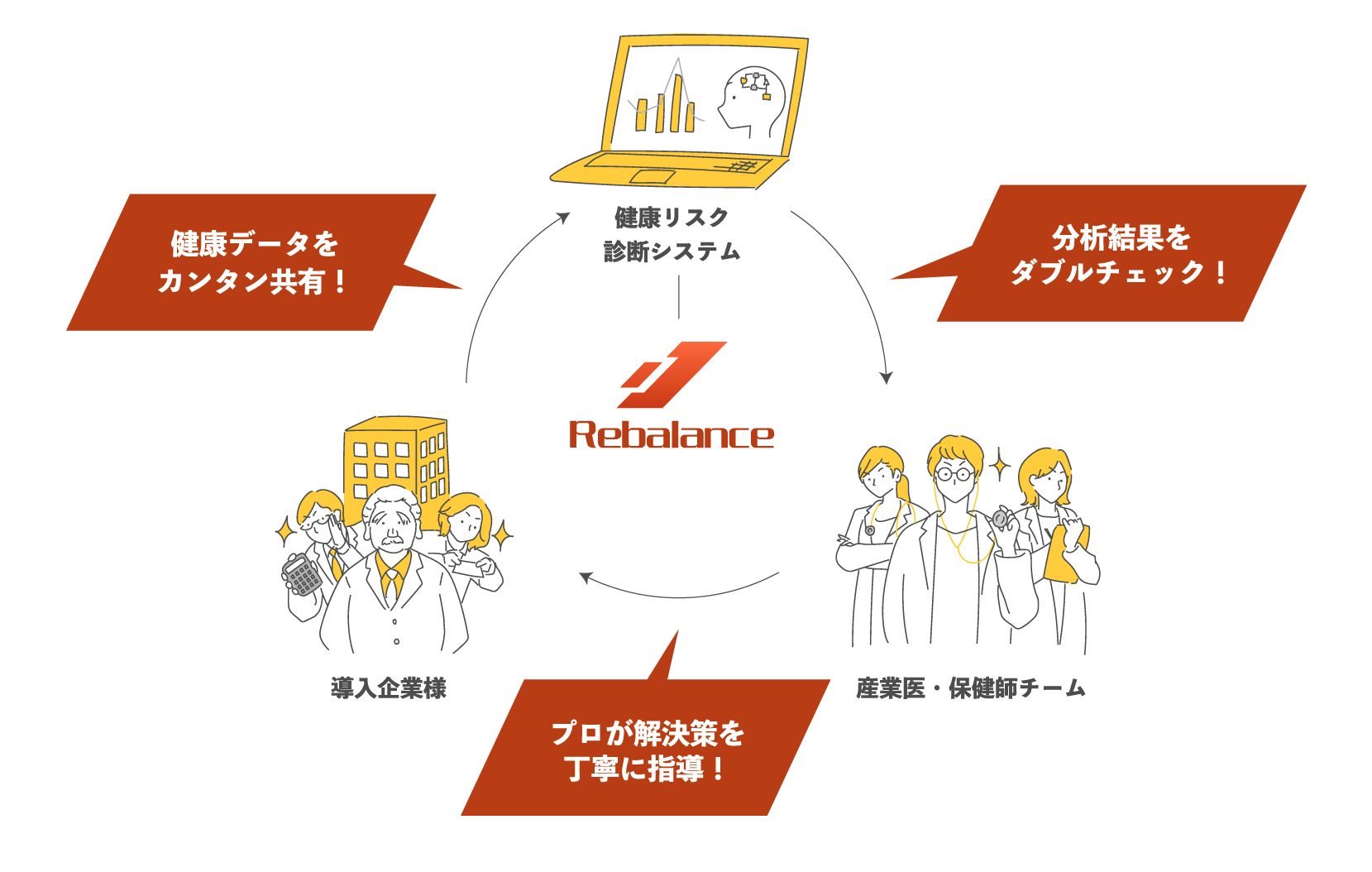 健康診断結果・勤怠データ・サーベイの3つをチェックし、フィジカル・メンタル・働き方のリスクを確認。産業医・保健師が状態改善までフォローします。