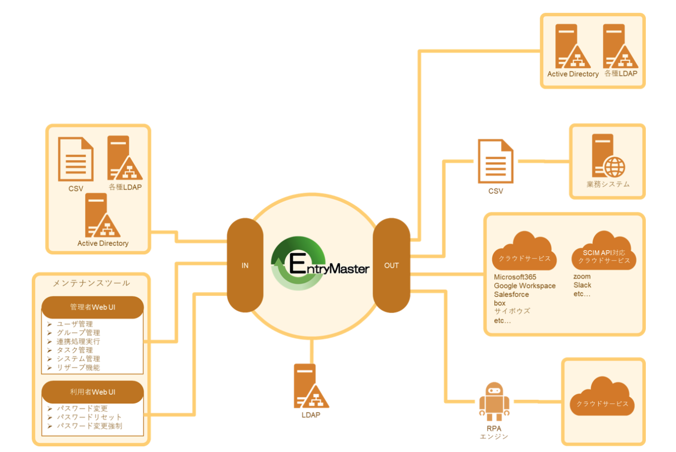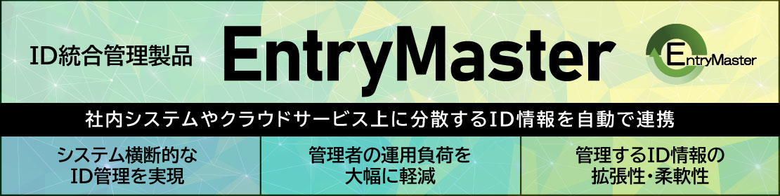 EntryMasterは各種システムやクラウドサービスの利用拡大に伴い、分散してしまったID情報を一元的に管理するソフトウェアです。Active Directoryや各種LDAP、CSVファイル、クラウドサービスなどに対応可能です。証跡(ログ)機能、多様な外部連携先へのインターフェース、管理者/利用者向け機能などを提供します。