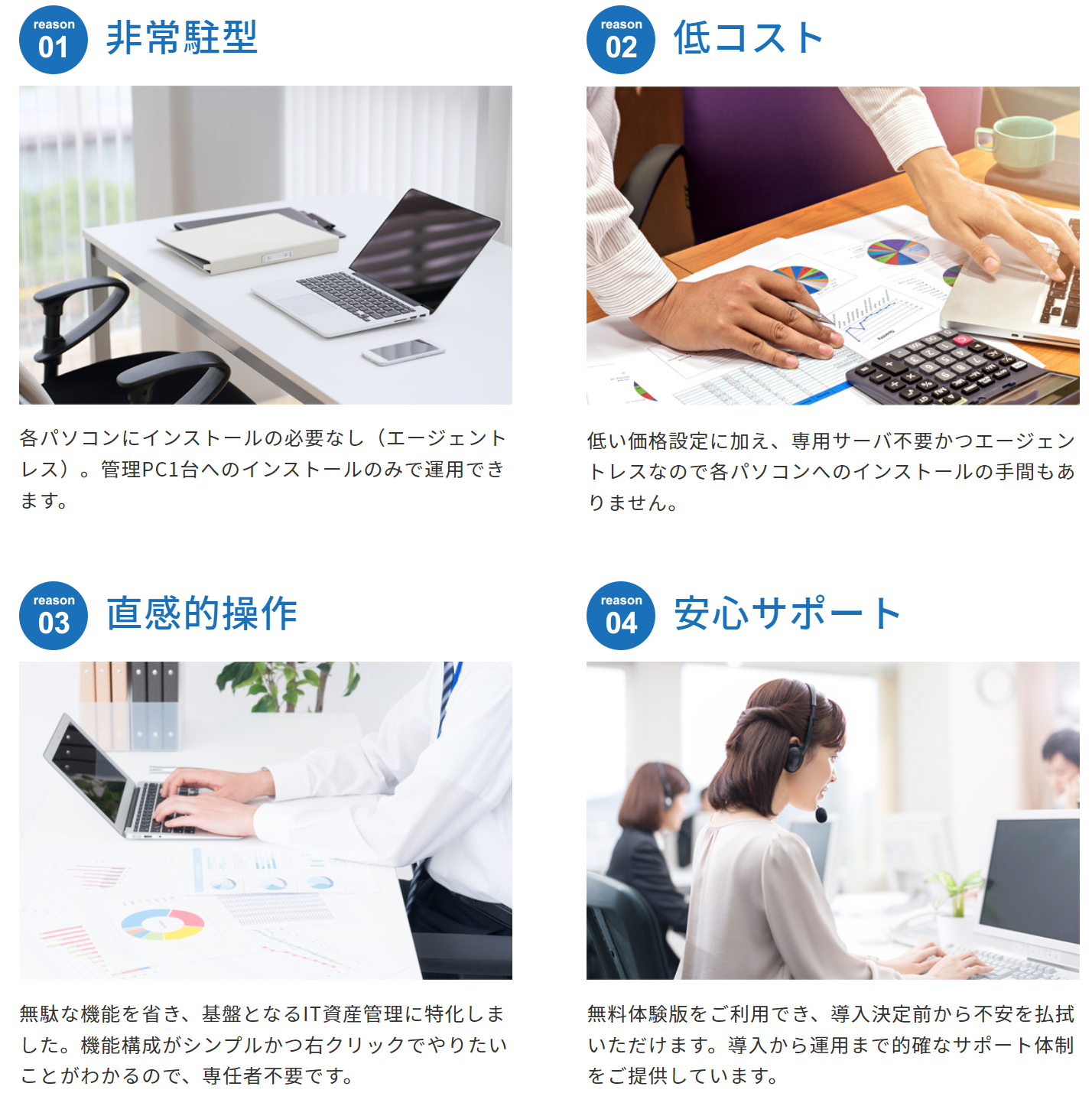 無駄な機能を省き、基盤となるIT資産管理に特化しています。機能構成がシンプルで、専任者不要で運用できます。