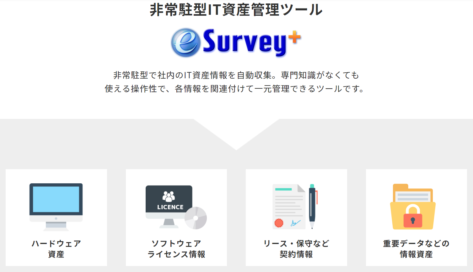 e-Survey+は非常駐型のIT資産管理ツールです。ハードウェア、ソフトウェア、ライセンス情報、リース・保守契約、重要データなど、多様なIT資産情報を一元管理できます。専門知識がなくても使える直感的な操作性があります。