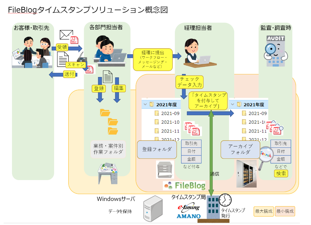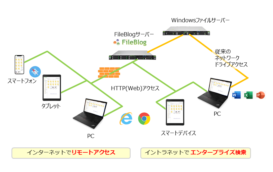 FileBlogは多様な端末と導入環境に対応しています。Windowsセキュリティに連動し、ユーザ登録情報の保守なしに導入・運用が可能です。また、ファイルサーバのフォルダをそのままWeb共有するため、導入時の面倒な文書の初期登録作業が不要です。