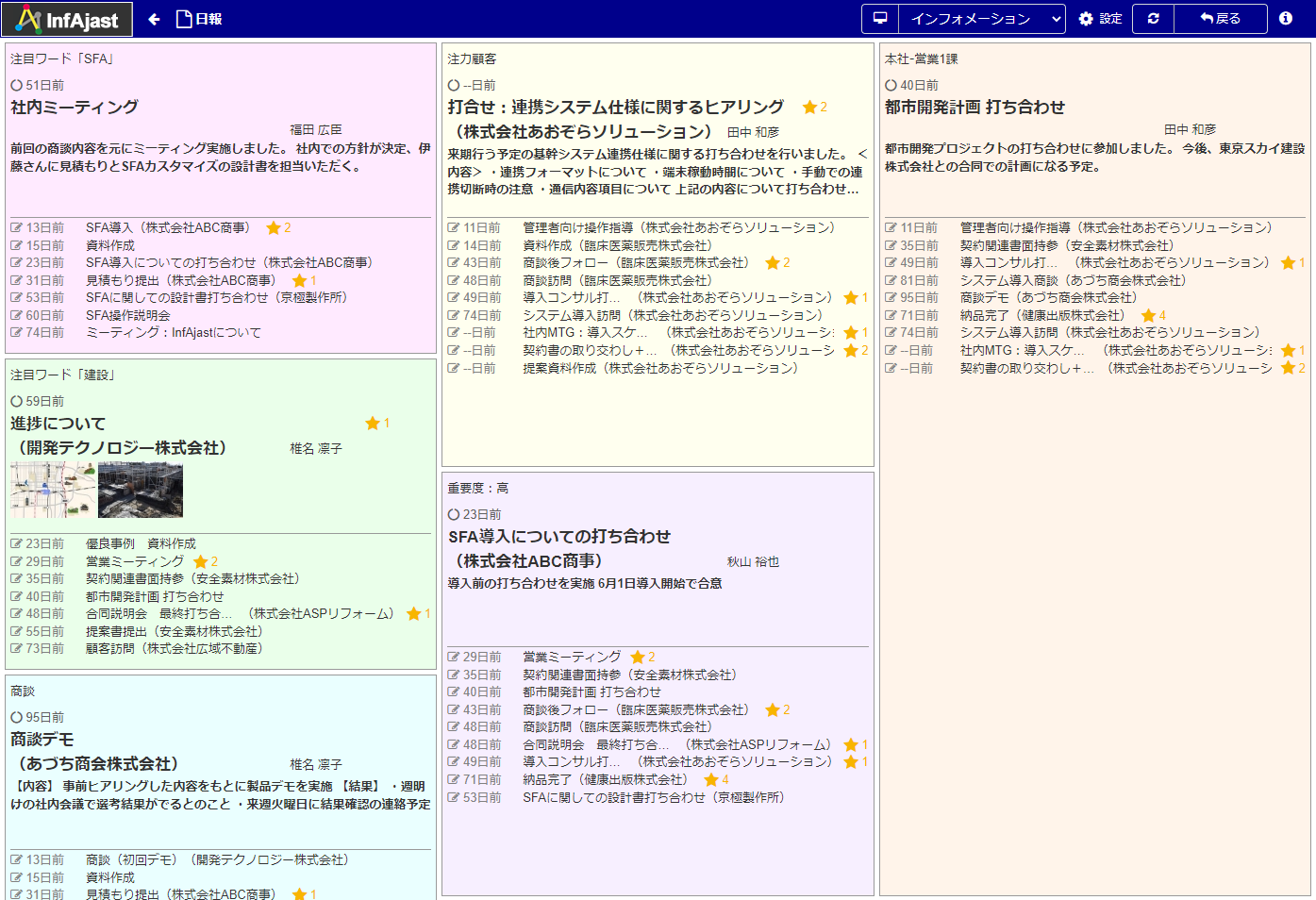 日々の報告日報を重要な取引先、商談関連の報告や気になるワードなどカテゴリー別に閲覧することができます。社内の近況をニュースアプリのように確認できるので、重要な報告を見逃しません。