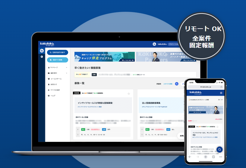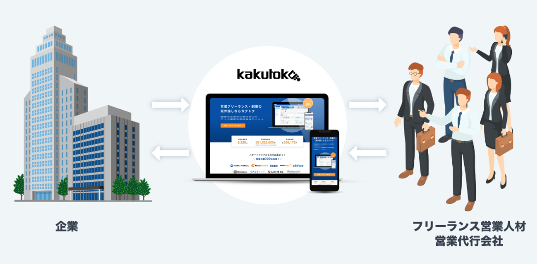 kakutokuはフリーランス営業職専門の日本最大級営業代行プラットフォームです。企業は営業課題を掲載し、フリーランスは自分のスキルが活かせる企業を見つけ、支援プランを提案します。