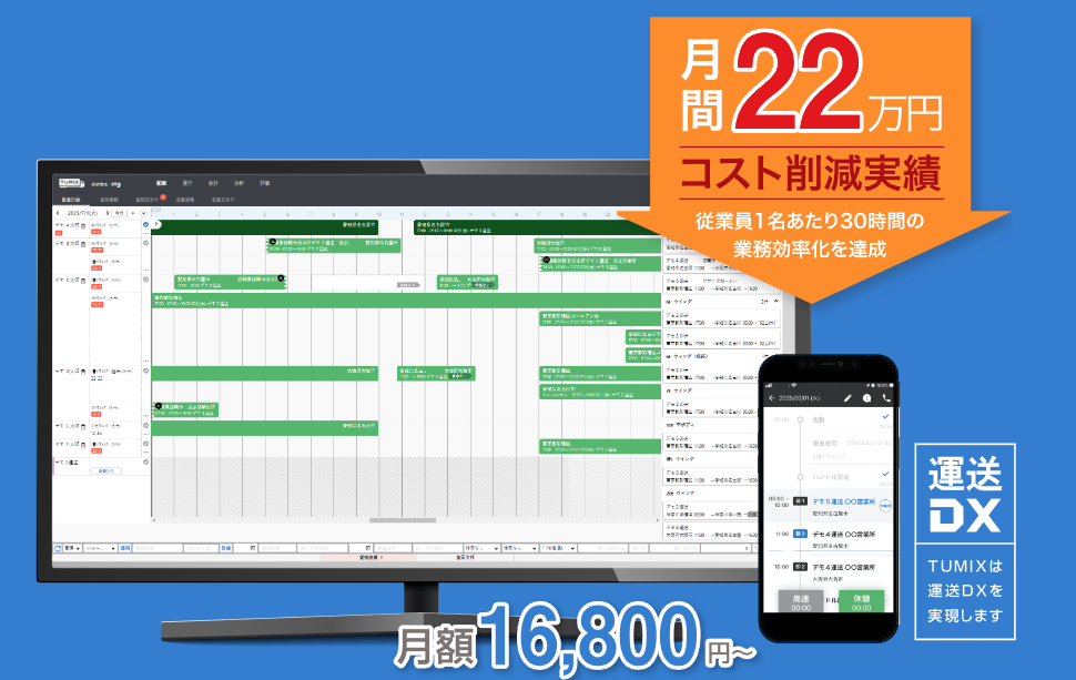 TUMIX配車計画は、中小運送会社向けのクラウド型配車管理システムです。配車、請求、支払い、多数の帳票を一元管理し、業務効率を大幅に向上させます。直感的な操作と多数の機能を備え、配車表、請求書、実務帳票、データ分析など、運送業務のあらゆる面をカバーします。さらに、スマートフォン対応で外出先からでも利用可能です。