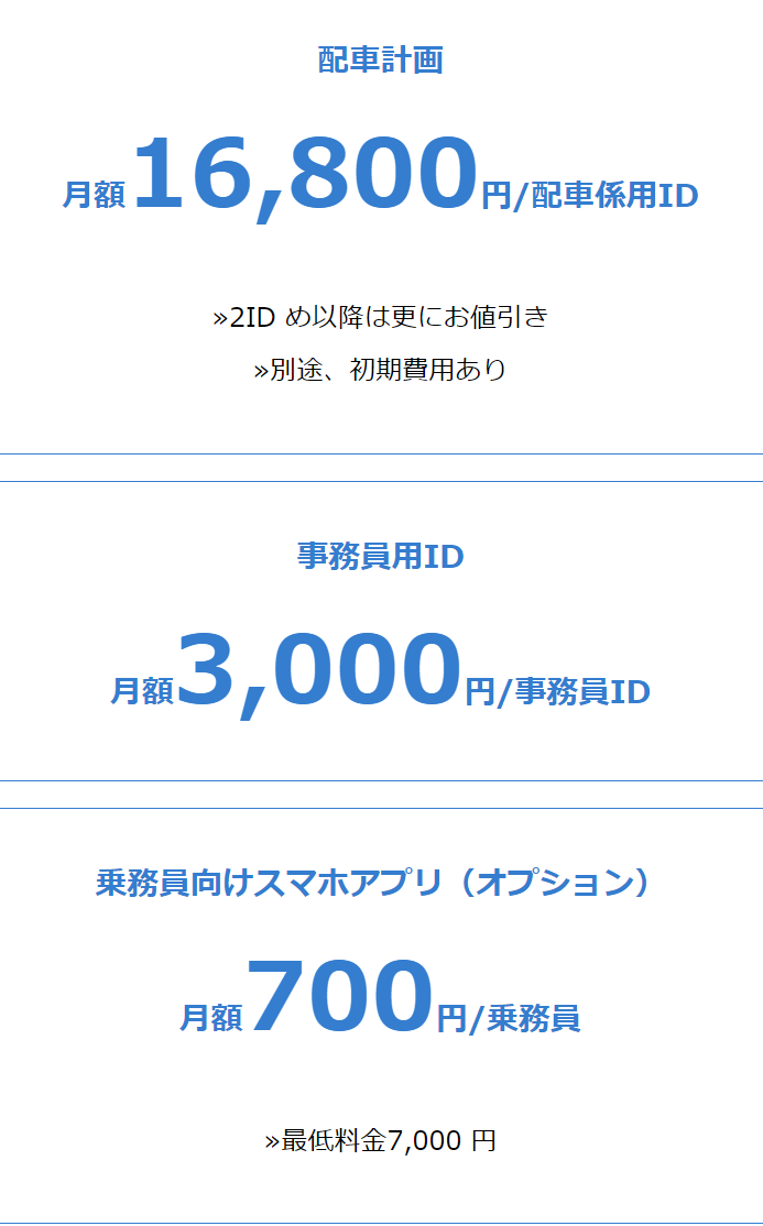 配車係用ID:月額16,800円、事務員用ID:月額3,000円、乗務員向けスマホアプリ:月額700円(最低料金7,000円)、初期費用あり