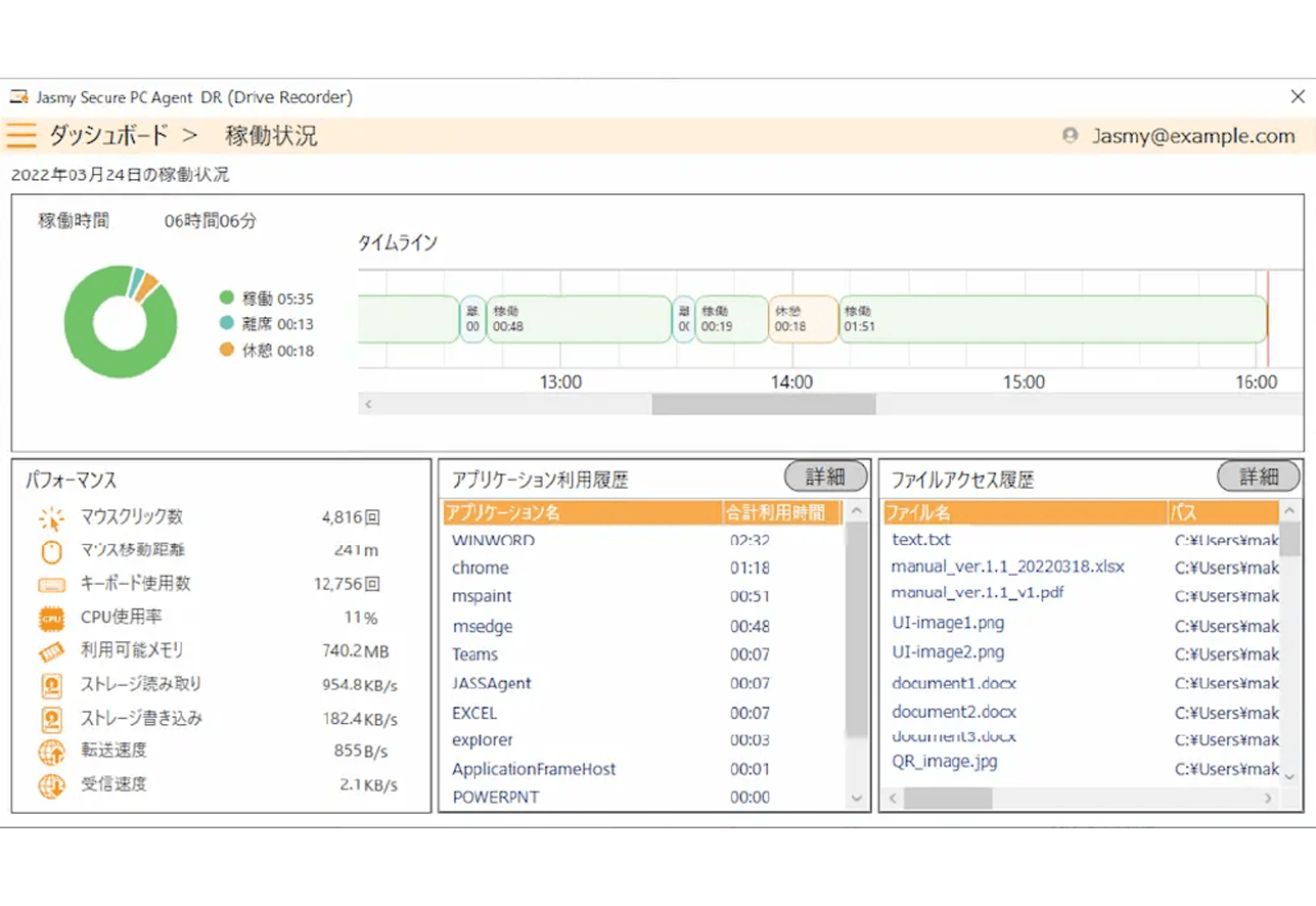 Jasmy Secure PCは、従業員のPC操作ログをクラウドに記録し、作業の実態を可視化することで業務改善のポイントを明確にします。管理者はダッシュボードを通じてリアルタイムで稼働状況を把握し、非効率な業務フローの特定や改善提案を迅速に行うことが可能です。生産性の向上と業務効率の最適化を支援します。