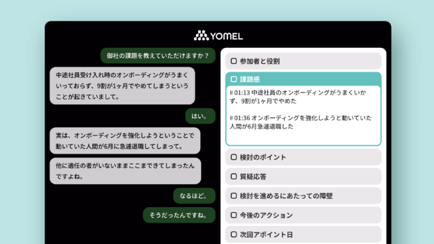 YOMELは、AIを活用して会議の音声を自動で文字起こしし、議事録を作成するクラウド型ツールです。会議の内容をリアルタイムで解析し、要約を生成。さらに、議事録の修正や共有も簡単に行えます。様々な会議形式に対応しており、テレワークやリモート会議でも活用可能です。