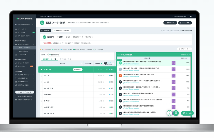 SEARCH WRITEは、SEO効果を高めるためのコンテンツ作成をサポートします。キーワードや競合データを分析し、最適なコンテンツの提案を行います。自動生成されたコンテンツは、SEO対策に優れており、検索エンジンの上位表示を目指すのに役立ちます。