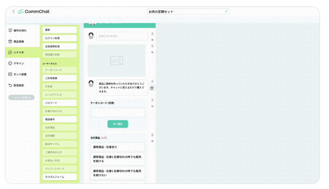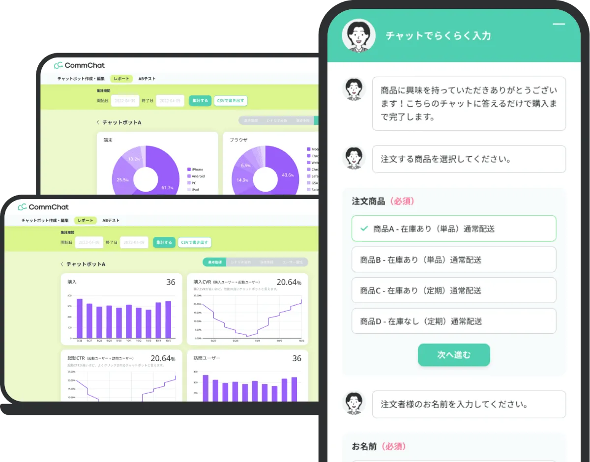 CommChatは、商品の購入フローを1ページにまとめ、チャット形式での回答を通じて、決済までワンステップで完了できるフォーム一体型ランディングページ(LP)を構築します。これにより、ユーザーにとってシームレスで快適な購買体験が提供されます