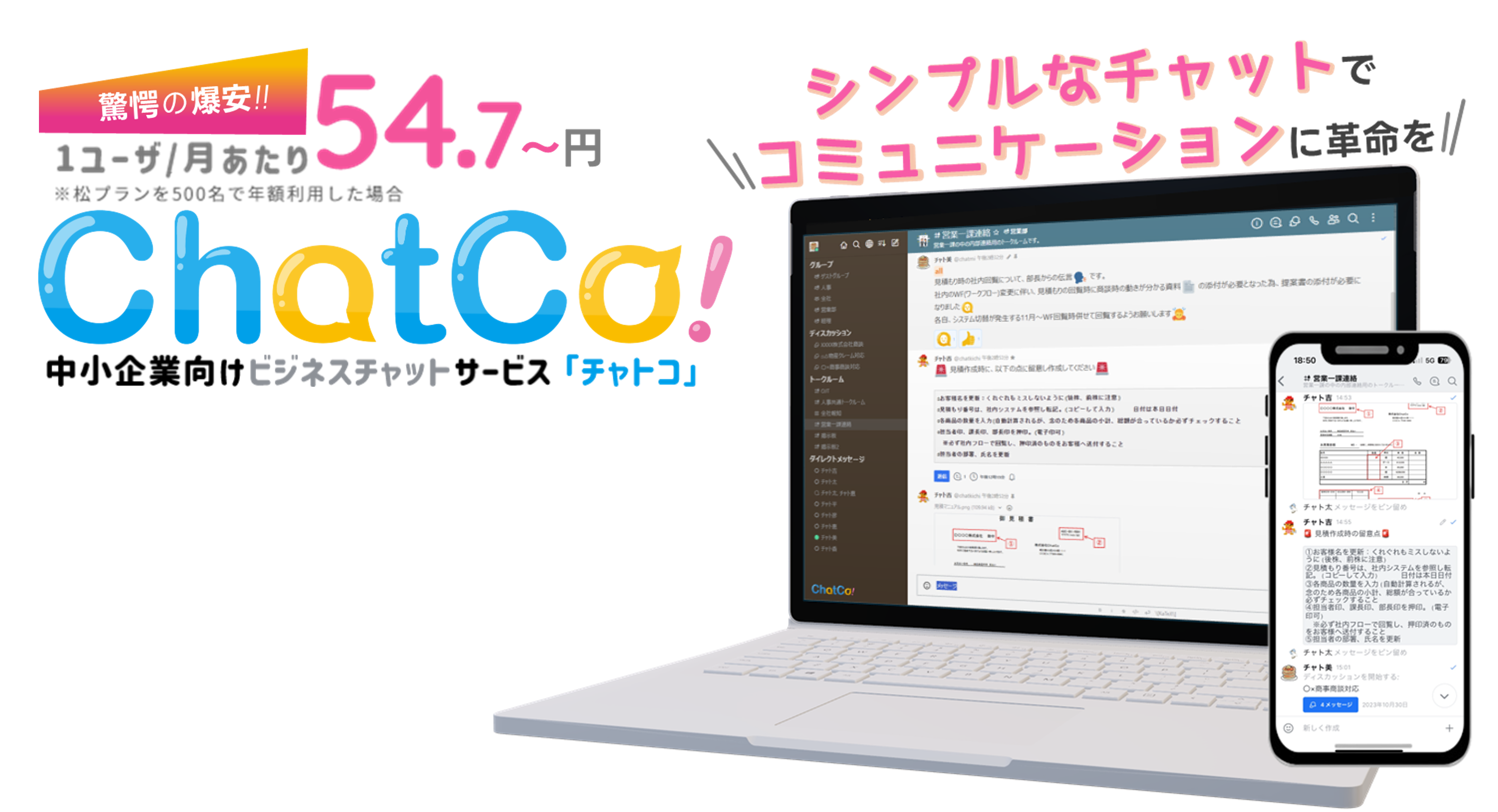 ChatCo!(チャトコ)は、圧倒的に低コストで提供されるビジネスチャットツールです。企業のコミュニケーションを効率化し、円滑な業務運営をサポートします。使いやすいインターフェースと優れたコストパフォーマンスが特徴で、多くの企業で採用されています。