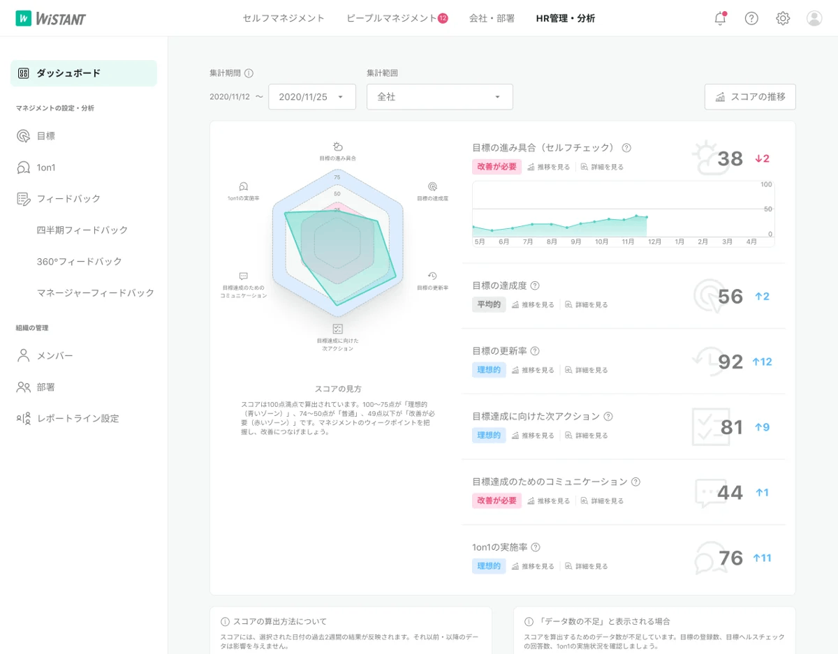 Wistantは、人材の育成や定着を支援するピープルマネジメントツールです。評価オペレーションの改善や、1on1ミーティングにおけるフィードバックを効果的に行うことを目的としています。組織内でのコミュニケーションを活性化し、従業員の成長と企業の持続的な発展をサポートします。