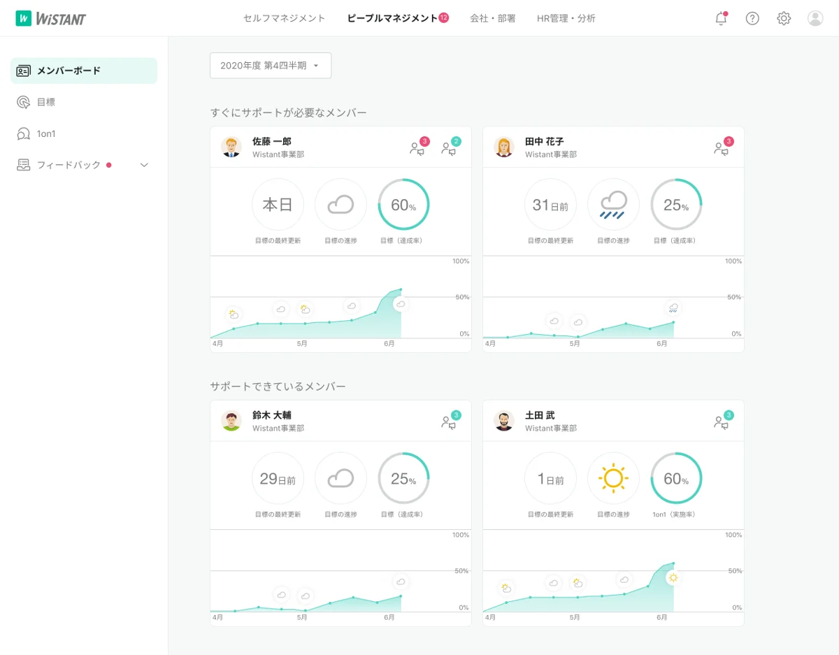 Wistantは、人材の育成と定着を実現するために設計されたピープルマネジメントツールです。1on1ミーティングやフィードバックを通じて、従業員の成長をサポートし、評価オペレーションの改善を実現します。組織内のコミュニケーションを円滑にし、従業員と企業の双方にとって有益な関係を構築します。