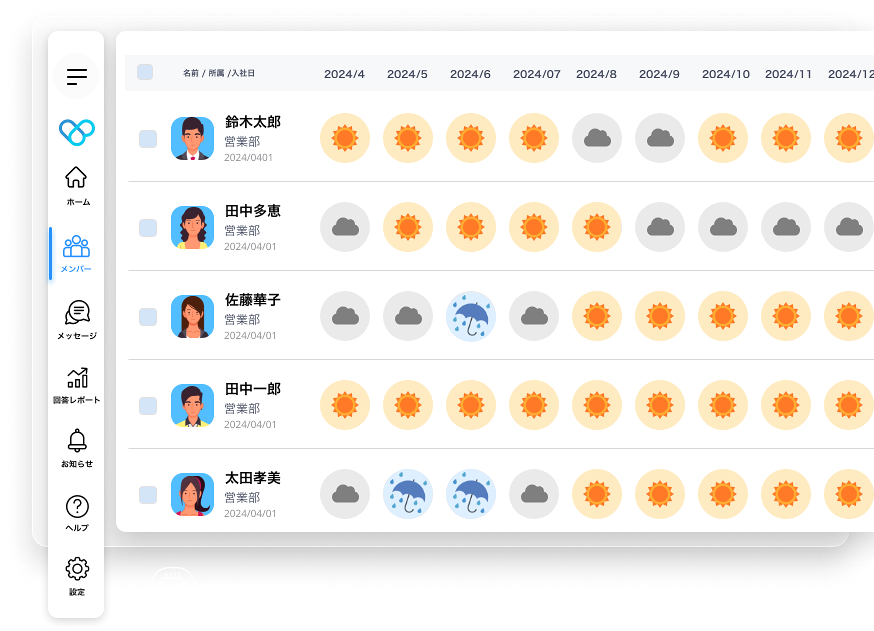HR OnBoardは、入社1年以内の社員が離職するリスクを早期に発見するためのツールです。毎月送信される3問の質問と、社員のスタンプ形式の回答により、社員のコンディションを視覚的に把握し、迅速なフォローを可能にします。AIによる自由回答の解析機能も搭載予定で、社員の「SOSサイン」を高精度にキャッチします。