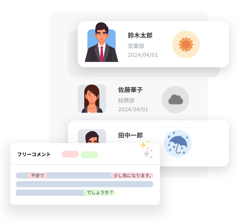 HR OnBoardは、入社1年以内の社員が離職する兆候を可視化し、具体的な対策をアドバイスするための離職予防ツールです。新卒・中途採用で入社した社員へ、入社後1年間、毎月3問ずつの質問を送信し、社員はオリジナルの「スタンプ」で簡単に回答します。人事担当者は「晴れ・くもり・雨」の3段階で視覚的に社員のコンディションを把握でき、自由回答の内容もAIによる自然言語処理システムで自動解析されます。この解析機能は2024年6月1日より提供開始予定です。