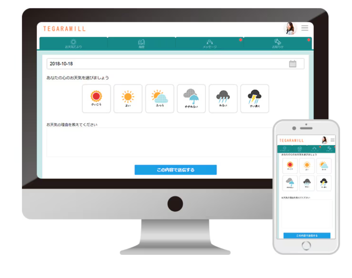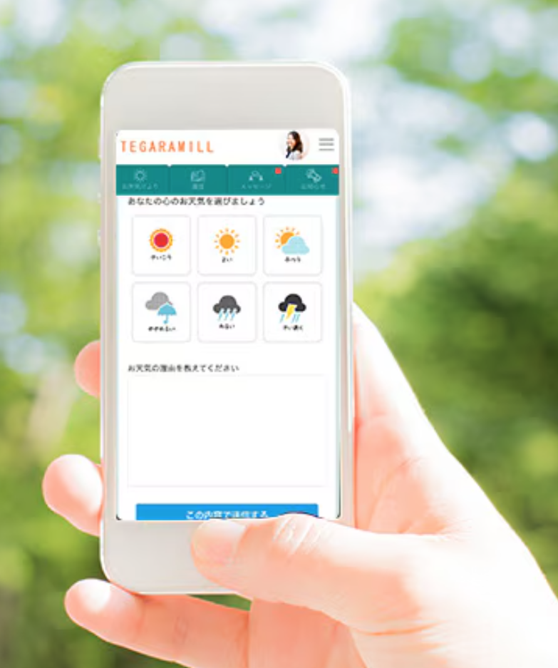 テガラみるは、従業員の心のコンディションをリモートで把握し、適切なフォローを提供するためのクラウドツールです。簡単に入力できるお天気だより機能を使い、管理者はタイムリーに従業員の状態を確認し、対応を行うことができます。