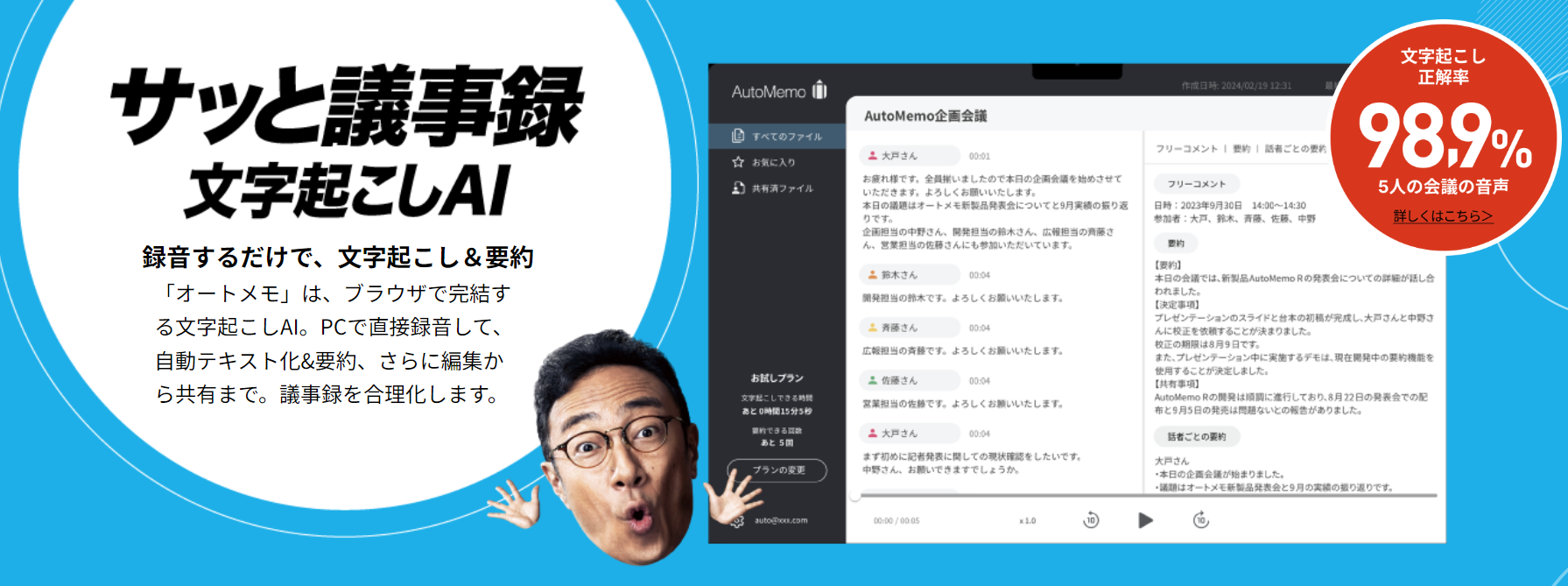 AutoMemoは、会議の音声をリアルタイムで文字起こしし、自動で議事録を作成します。高精度な音声認識技術により、正確な議事録を迅速に生成できます。