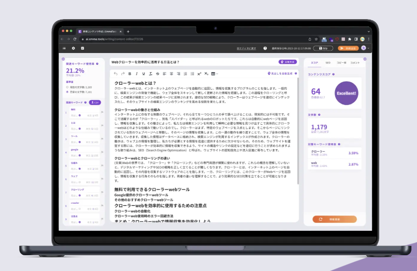 EmmaToolsは、SEOに特化したクラウドベースのライティングツールで、キーワード分析から記事の構成作成、ライティング、順位測定、リライトまで、SEO記事の作成を効率化します。AIを活用して記事のスコアを自動で可視化し、SEOに強いコンテンツを作成するための改善提案を行います。さらに、公開済みの記事のSEO健康状態を定期的にチェックし、順位下落の防止やリライトのタイミングを判断します。