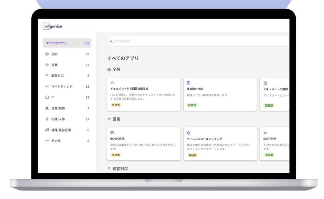 Alli GPTは、RAG技術を使用して、指定された社内ドキュメントやWebデータから必要な情報を抽出し、適切な回答を生成します。これにより、社内のナレッジ共有や顧客対応を効率化し、業務全体の生産性を向上させます。