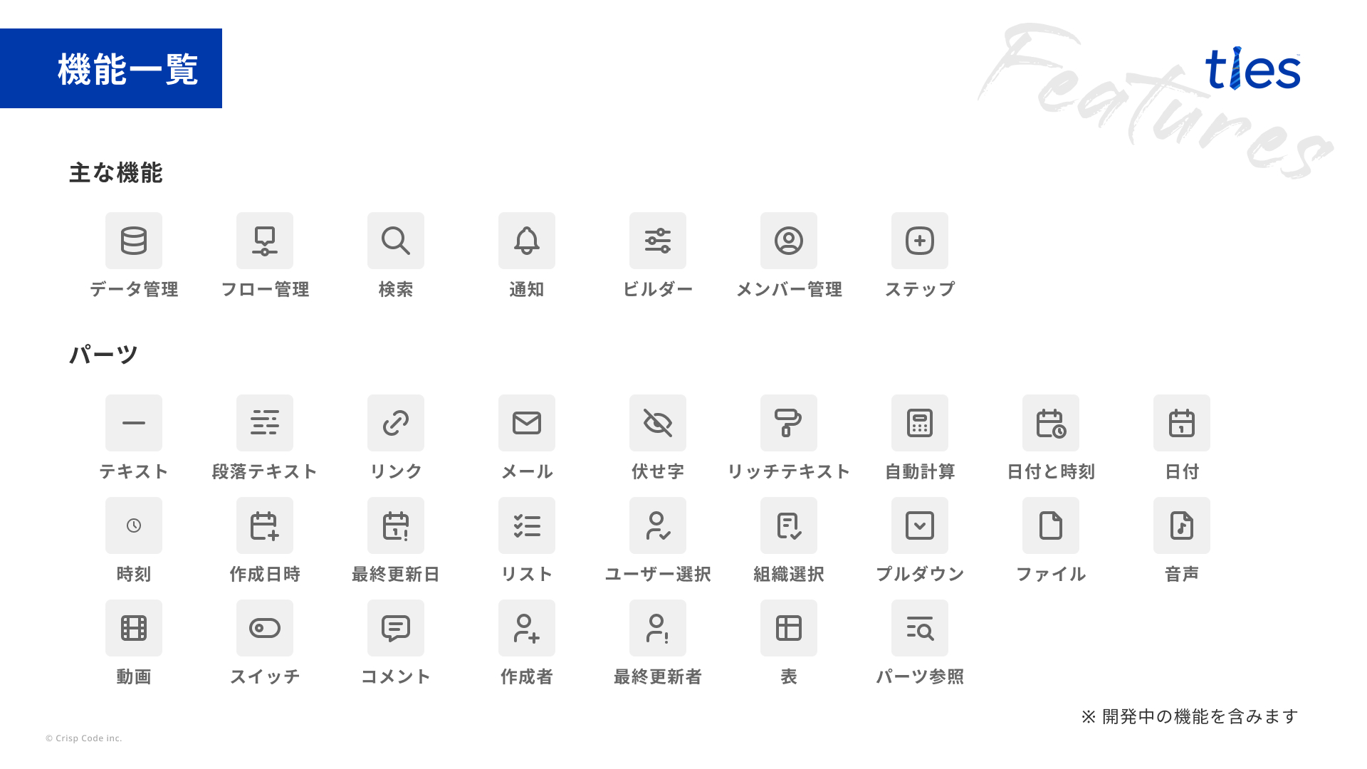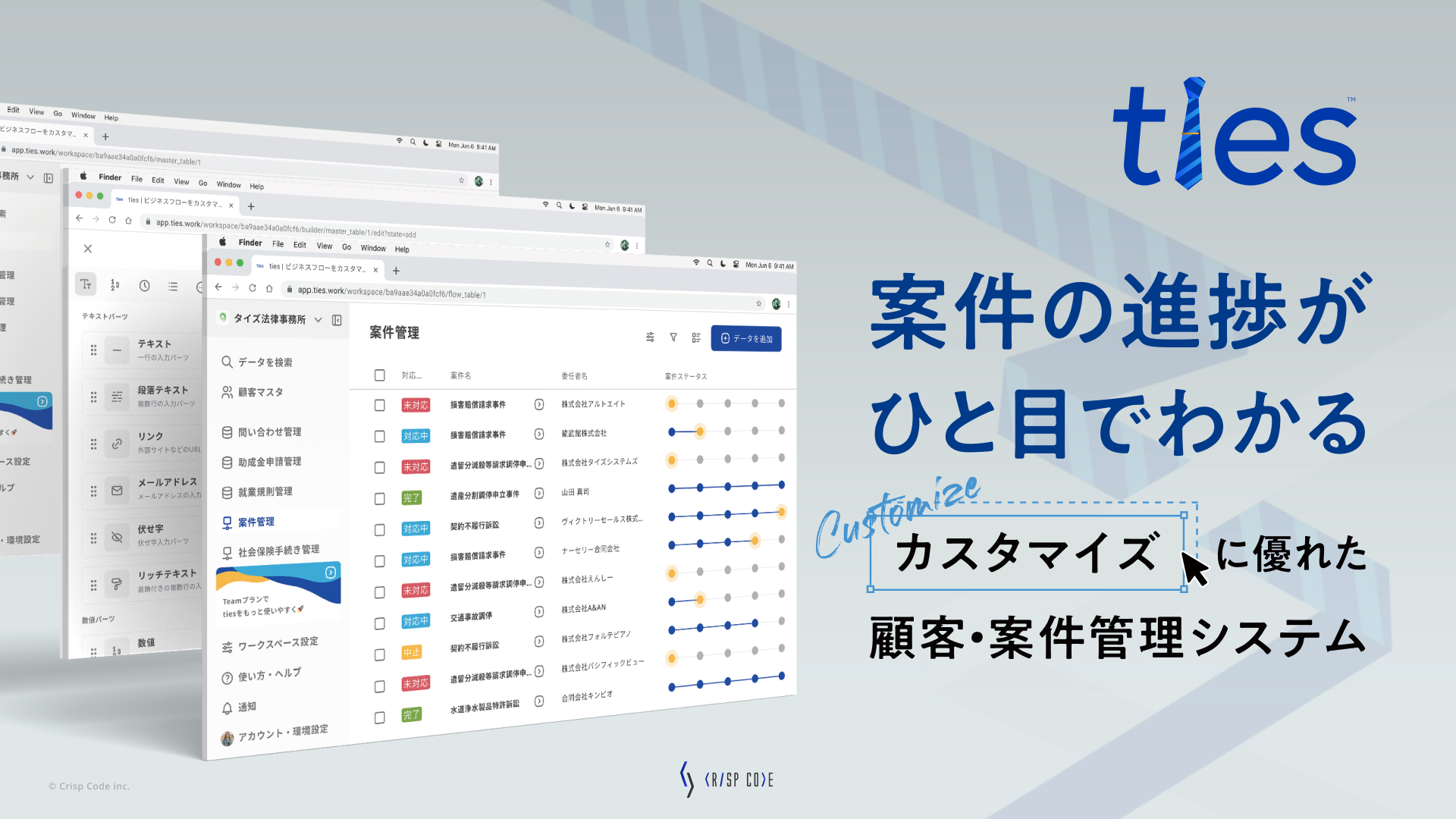 tiesは、自身にあった項目にカスタマイズできる「顧客・案件管理システム」です。 中小企業や個人事業主が抱える顧客や案件などのあらゆる情報をマメに管理することで、 機会損失を防ぐのはもちろん、売上を伸ばす自身の強みを見つけることができます。 今までのエクセルや紙の管理から脱却しませんか?