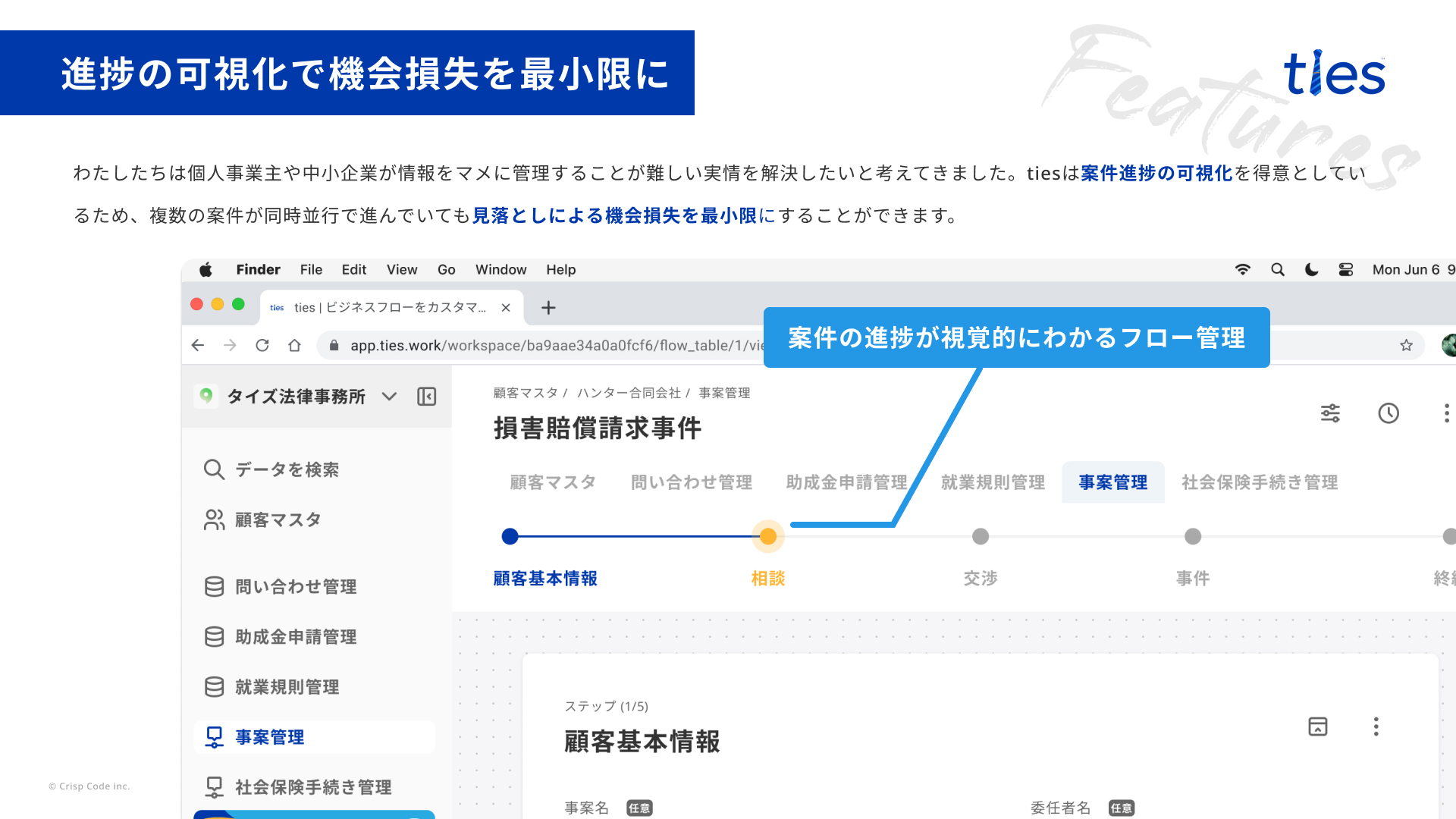 tiesは優れたカスタマイズ機能によって顧客や案件の情報を自社に合わせた一元管理ができ、進捗を可視化することで機会損失を最小限に抑えることができます。