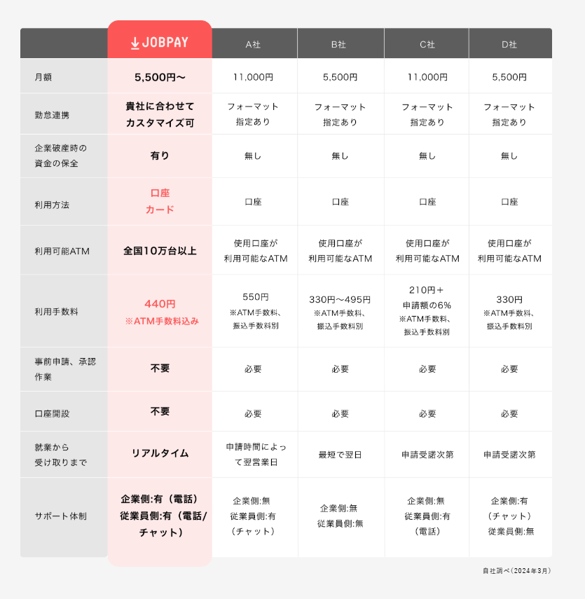 JOBPAYは、勤怠システムと連携し、働いた分の給与を即時に受け取れるサービスです。申請不要で、銀行口座がなくてもATMから現金を引き出せる便利さが特長です。政府が推進する「働き方改革」や「デジタル給与」に対応し、多様な働き方にフィットした柔軟な給与受け取りシステムを提供します。給与の受け取りタイミングや手段を自由に選べることで、利用者の暮らしをより豊かで便利にすることを目指しています。
