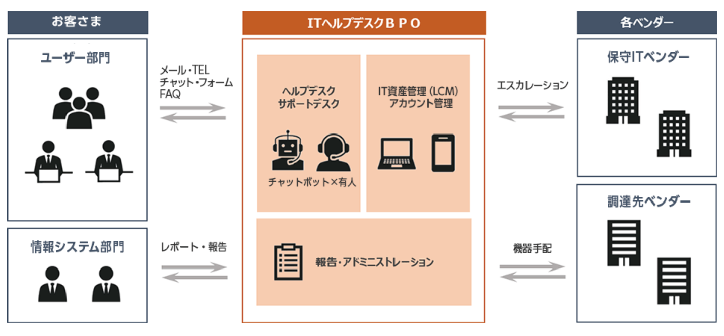 クラウド型ヘルプデスクBPOサービス。オフサイト提供、チャットボット対応。